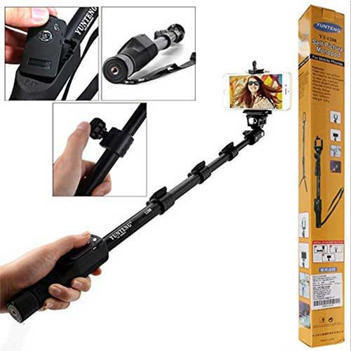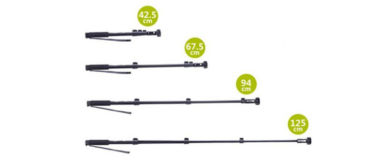 متشکل از ۴ تکه تلسکوپی (نحوه باز شدن: گیرهای) - حداکثر طول: ۱۲۵ سانتیمتر - حداقل طول: ۴۲.۵ سانتیمتر - جنس: آلومینیوم - وزن: ۲۳۵ گرم - دارای بند دستی - قابلیت شارژ ریموت از طریق کابل microUSB - قابل استفاده با گوشیهای موبایل - قابلیت زوم با دستگاه های با سیستم عامل iOS سازگاری دارد - قابل استفاده با دوربینهای دیجیتال کامپکت - دارای ریموت کنترل با قابلیت قرار گیری و اتصال به دسته مونوپاد - دارای آیینه ای کوچک بر روی قسمت نگهدارنده گوشی برای کادربندی بهتر - قابلیت چرخش ۳۶۰ درجه و تنظیم قسمت نگهدارنده گوشی در زوایای مختلف - برای عکاسی می بایست برنامه دوربین توسط خود کاربر فعال شود - درصورتیکه دکمه زوم برای برخی از گوشی های اندرویدی کار نکرد، باید به قسمت تنظیمات دکمه صدا مراجعه کنید و آن را در حالت زوم قرار دهید(Volume Button Key) - قابلیت استفاده با گوشی موبایل و دوربین های عکاسی